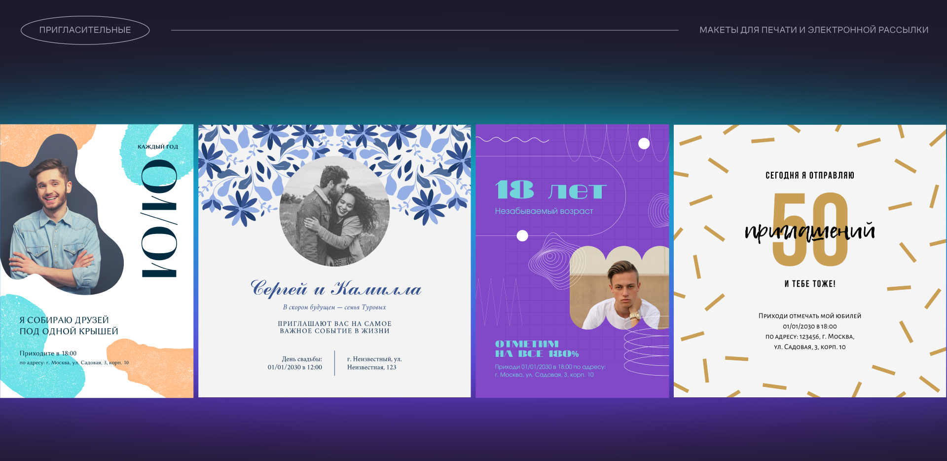 В мои задачи входило создание макетов открыток, пригласительных, чек-листов, постов и др. с использованием уже готовых графических ассетов. Всего за время работы в компании я сделала около 200 макетов.