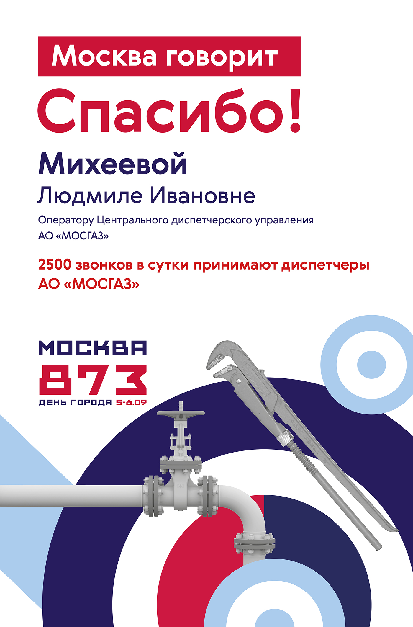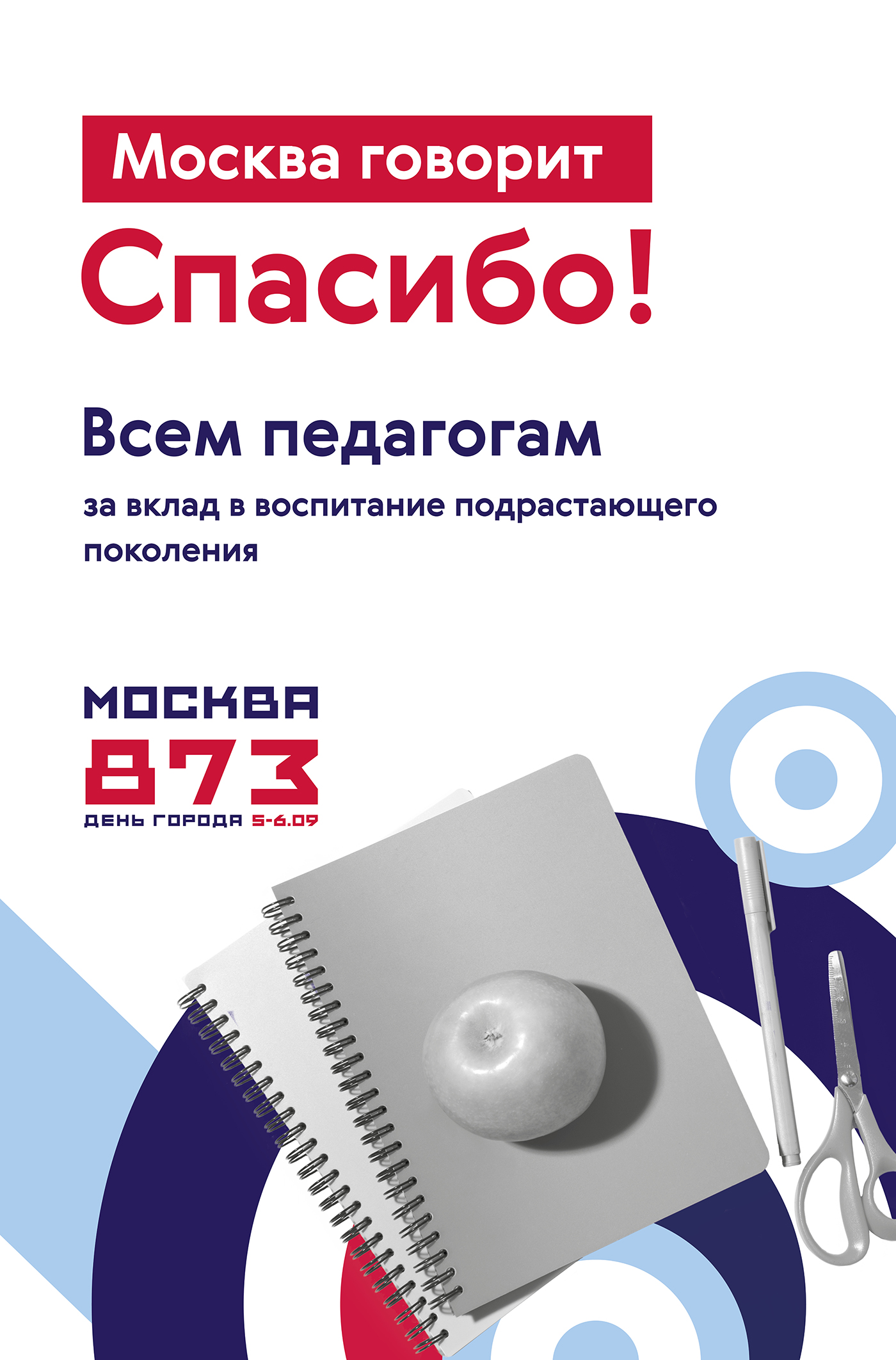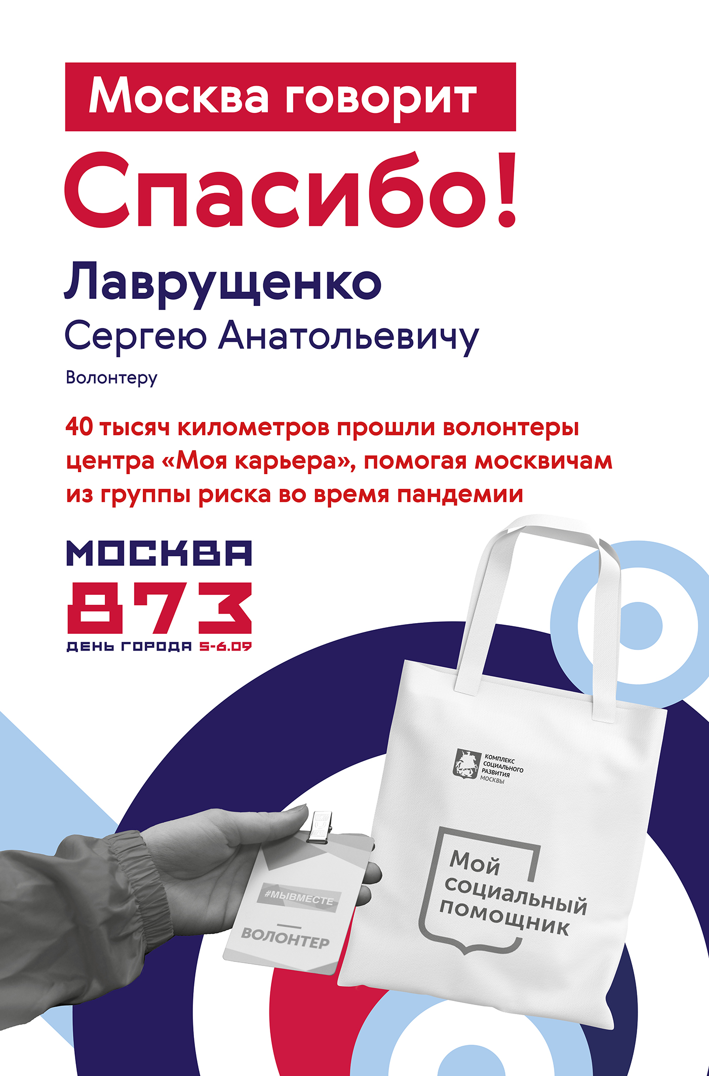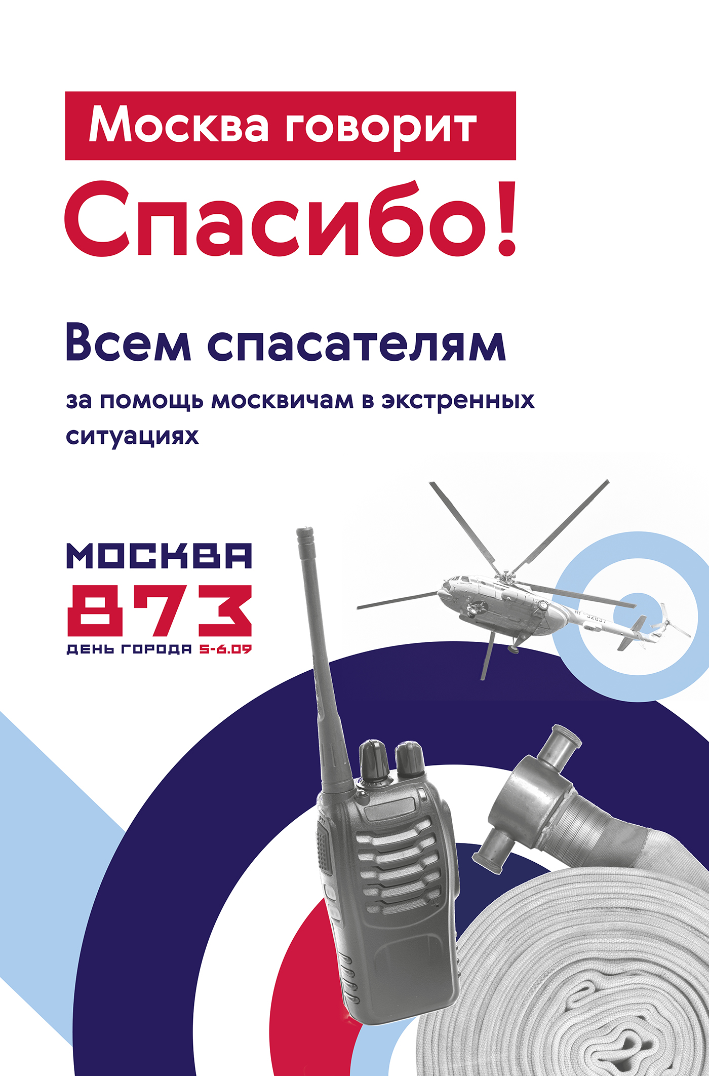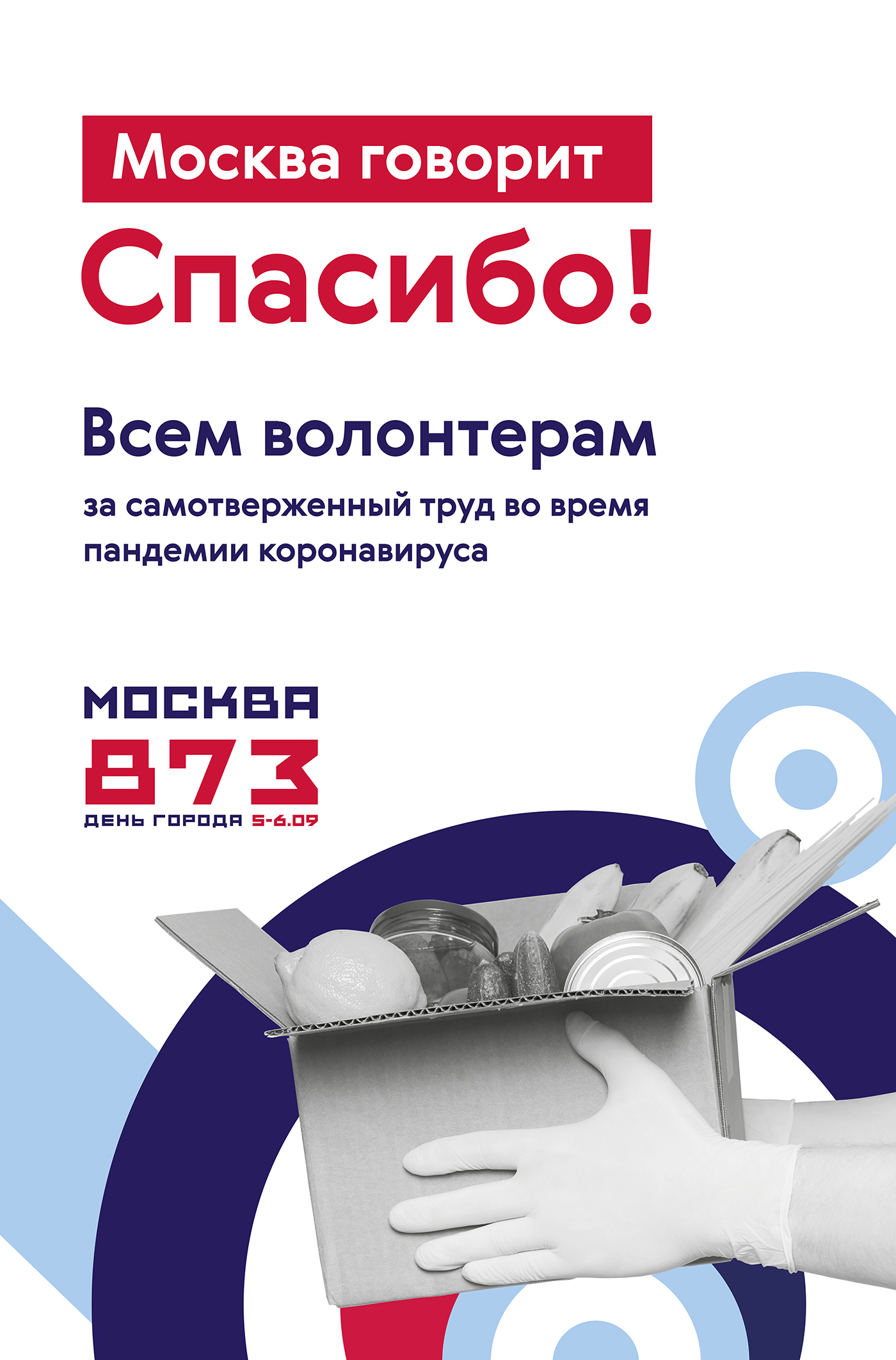 Когда передо мной и моей командой встала задача сделать рекламные плакаты ко Дню Рождения Москвы в 2020 году, мне, как арт-директору, хотелось создать что-то неожиданное. Год выдался тяжелым из-за пандемии и изоляции, и мне показалось важным, чтобы город в свой праздник поблагодарил жителей за их вклад в преодоление этого непростого периода. Так родилась концепция «Москва говорит «Спасибо!». Часть плакатов были посвящены благодарностям представителям разных профессий. Впоследствии заказчик захотел добавить именные плакаты. Мне хотелось поблагодарить и курьеров, развозивших продукты в период, когда все сидели взаперти, но, к сожалению, эта идея не была приняла заказчиков. За основу дизайна был взят уже существовавший фирменный стиль дня города.