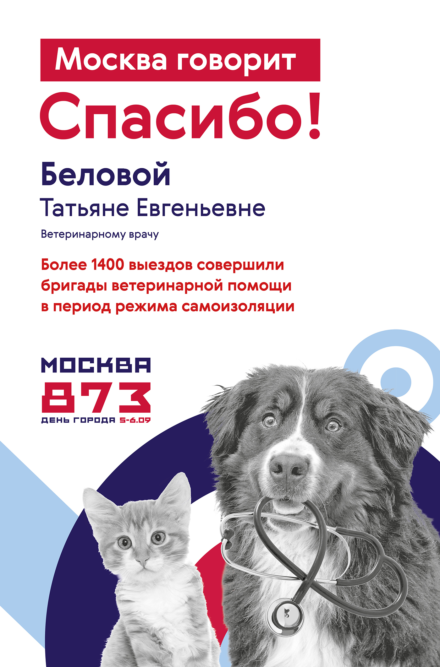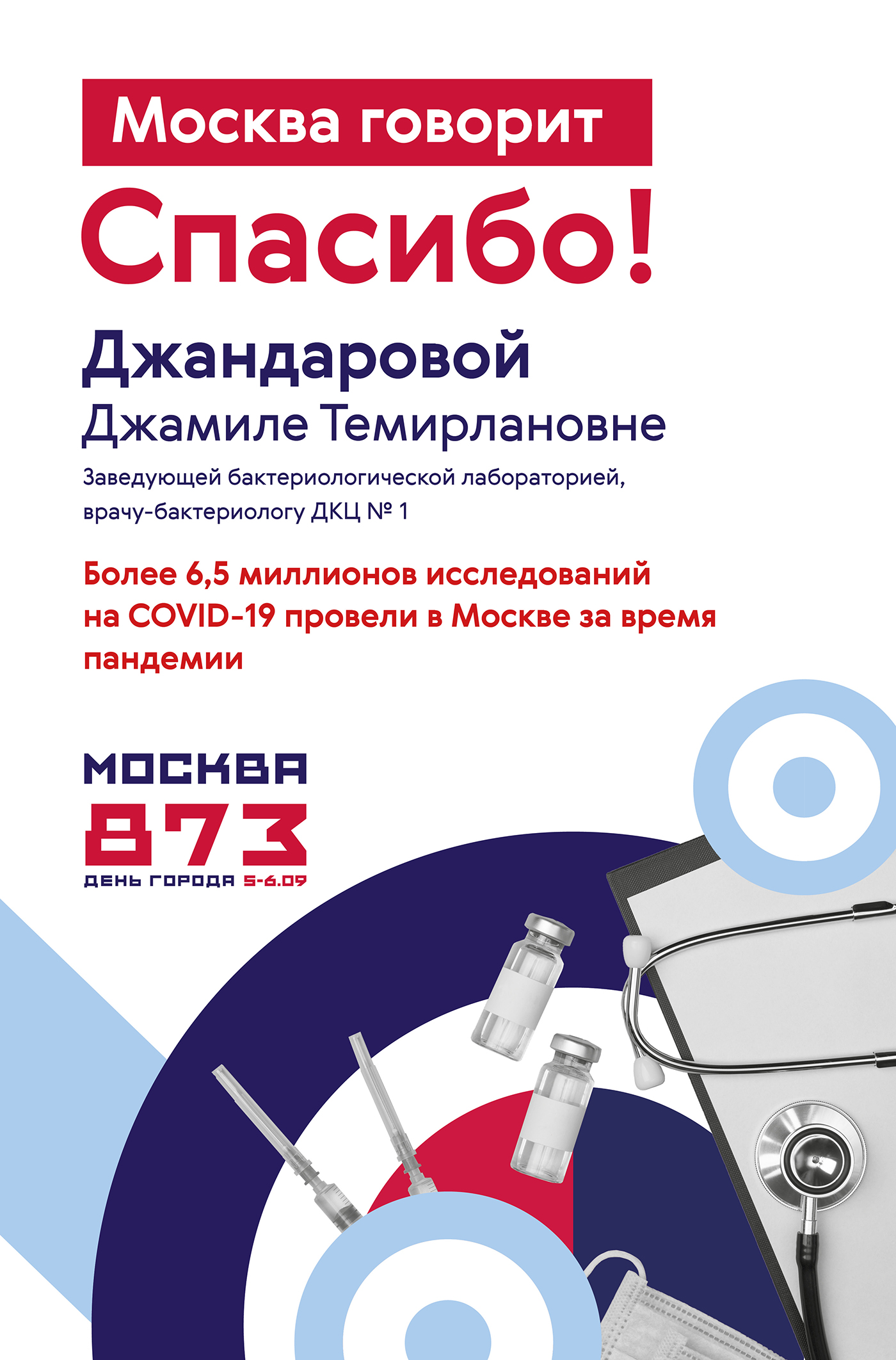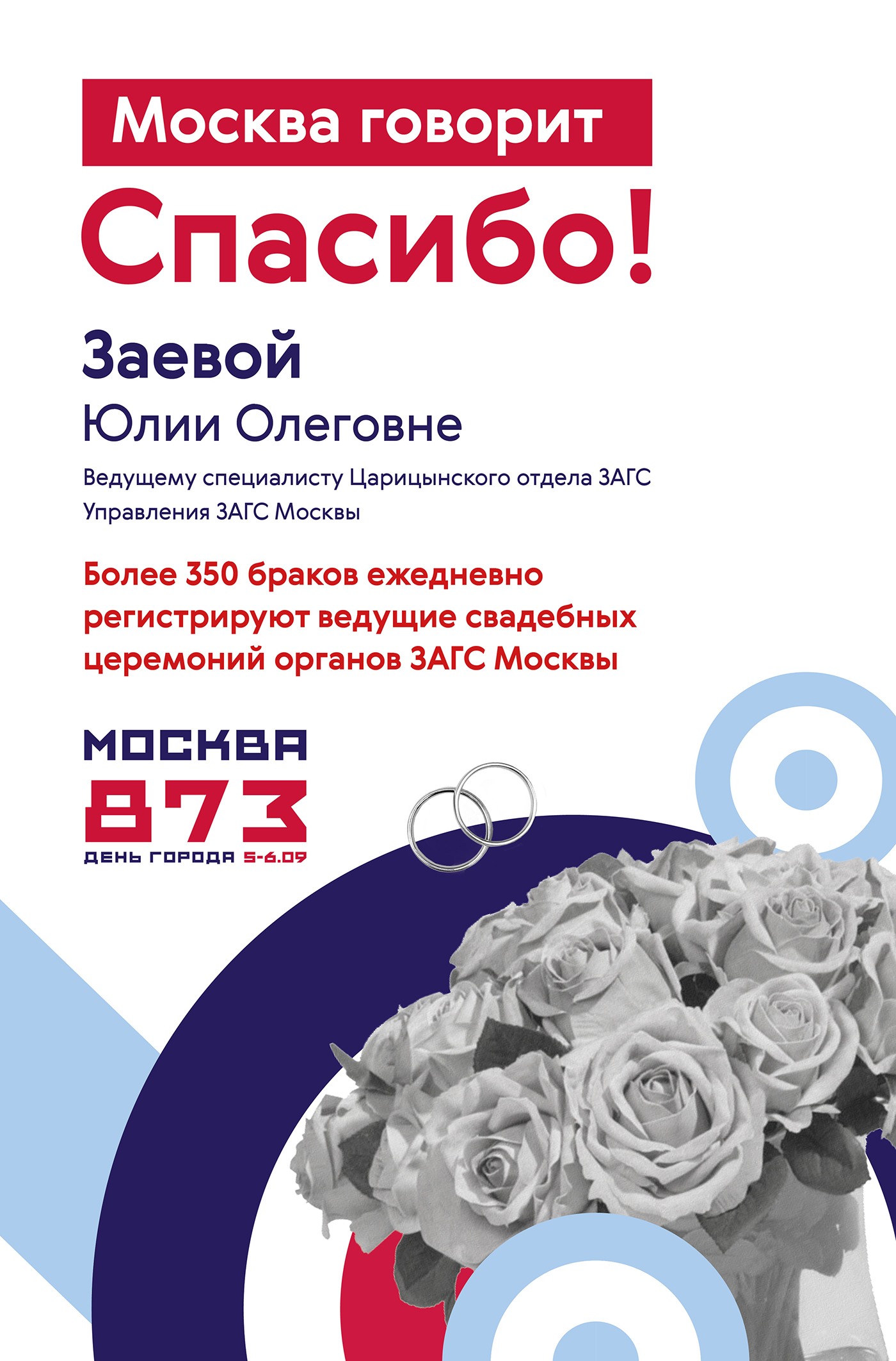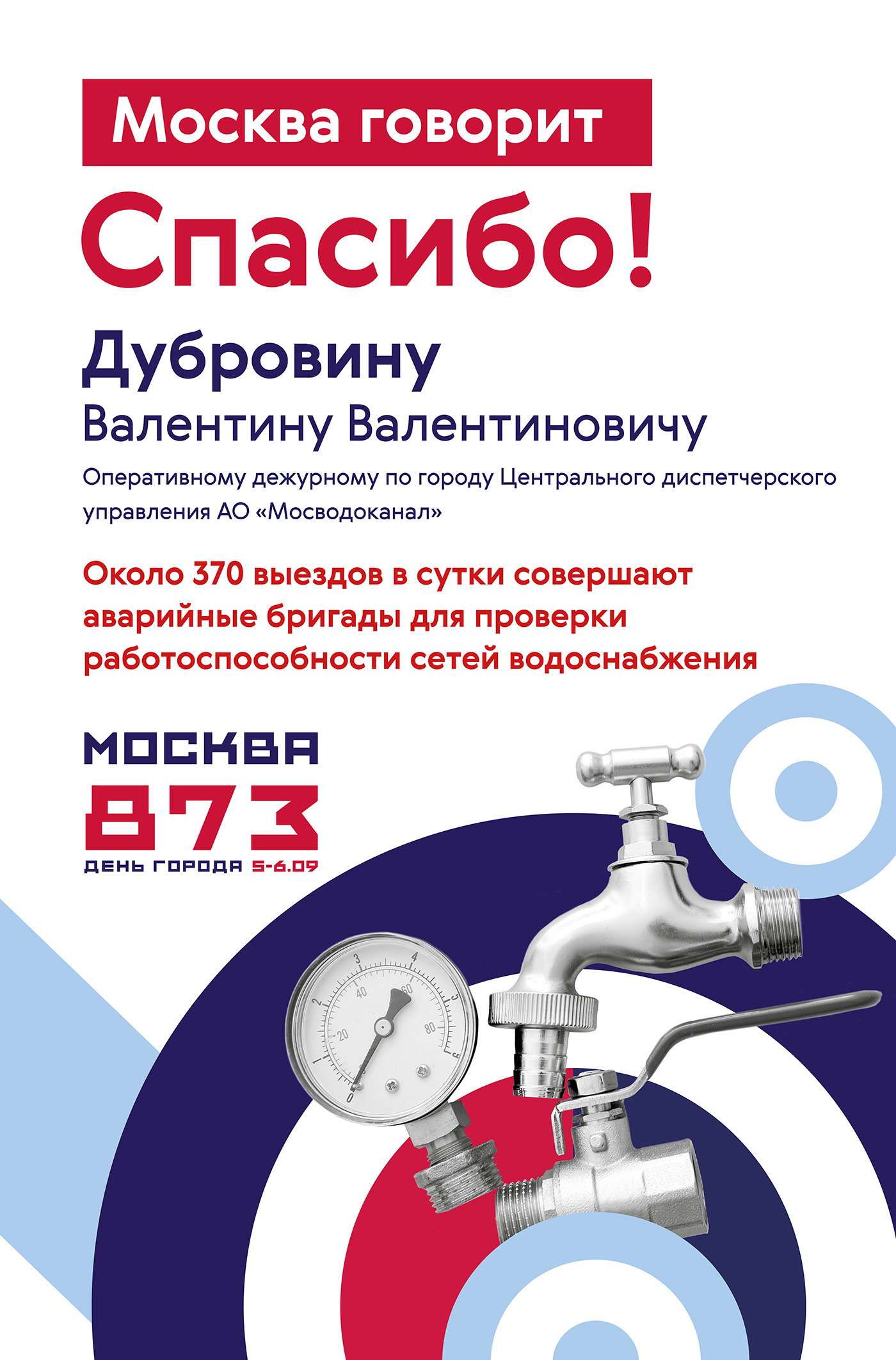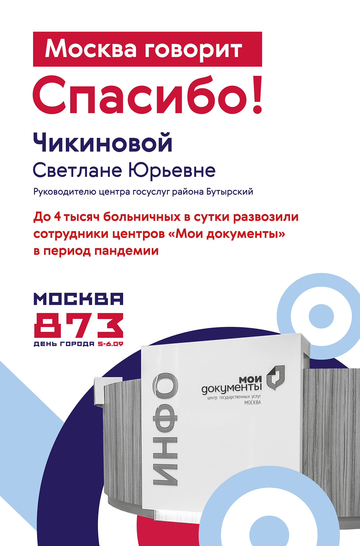 Когда передо мной и моей командой встала задача сделать рекламные плакаты ко Дню Рождения Москвы в 2020 году, мне, как арт-директору, хотелось создать что-то неожиданное. Год выдался тяжелым из-за пандемии и изоляции, и мне показалось важным, чтобы город в свой праздник поблагодарил жителей за их вклад в преодоление этого непростого периода. Так родилась концепция «Москва говорит «Спасибо!». Часть плакатов были посвящены благодарностям представителям разных профессий. Впоследствии заказчик захотел добавить именные плакаты. Мне хотелось поблагодарить и курьеров, развозивших продукты в период, когда все сидели взаперти, но, к сожалению, эта идея не была приняла заказчиков. За основу дизайна был взят уже существовавший фирменный стиль дня города.